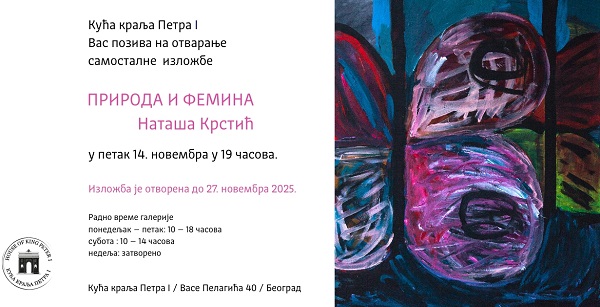 Izložene slike beogradske umetnice Nataše Krstić odgovaraju zrelom periodu stvaralačkog rada ove slikarke, modne dizajnerke i esejistkinje. Autorkino slikarstvo svojevrsno je utočište od nevolja realnosti, ali i klica za stvaranje nove realnosti. Iza simbolizma i subjkektivnosti izdanaka njenog opusa, čvrsto opstaju svest i kritički odnos prema vrednostima savremenog trenutka, ali i jedan duboko humani odnos prema čoveku, njegovim iskonskim potrebama i kulturnom nasleđu. Radoznala, s poverenjem u znanje, koje se utkiva u njena razmišljanja i slike, u umetnosti nesvodljiva i afektivna kao neočekivana sila…, Krstićeva otvara vrata posebnom vidu slikarstva kod nas, i, istovremeno, odajama sopstvenog bića.