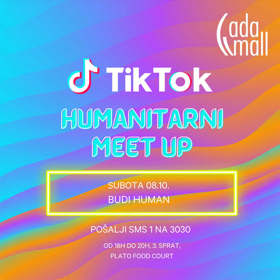 Oni su zvezde nove generacije koje prate armije klinaca. Govore jezikom videa, pokreta, muzike i skečeva na TikToku i to auditorijumu koji broji stotine hiljada tinejdžera. Ada Mall shopping center u subotu 08.10. od 18 časova organizuje Humanitarni Meet Up. Pozivamo vas da pošaljete humanitarni SMS 1 na 3030 organizacije BUDI HUMAN i u što većem broju dođete kako biste se družili sa svojim omiljenim facama sa TikToka i Instagrama, napravili zajednički selfi ili TikTok u nekoj od naših kućica. Muzikom će program obojiti specijalni DJ gost. Na drženje dolaze Gruberka, Vico, Mojke, Mala Kineskinja, Mića, Tiksica, Donžuan i Djoksam. Očekujemo vas na trećem spratu na platou FoodCourta u ADA MALL-u. Organizator događaja Ada Mall u saradnji sa Upoznaj Zvezdu Media.