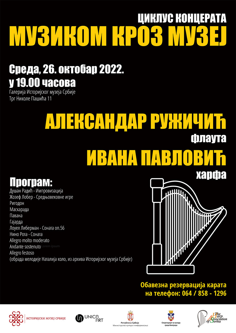 Istorijski muzej Srbije i udruženje „UNICA ART” imaju zadovoljstvo da Vas pozovu da u sredu 26. oktobra u 19 časova prisustvujete koncertu flautiste Aleksandra Ružičića i harfistkinje Ivane Pavlović, drugom koncertu u okviru treće sezone ciklusa „Muzikom kroz muzej”. Koncert se održava u saradnji sa Udruženjem harfista Srbije u okviru manifestacije „XXI Međunarodni festival harfe”, a pod pokroviteljstvom Ministarstva kulture i informisanja Republike Srbije i Sekretarijata za kulturu grada Beograda. Zbog ograničenog broja mesta, zainteresovani građani, koji žele uživo da prisustvuju koncertu, moraju da rezervišu mesto na telefon 064/ 858- 1296. Rezervacije se primaju svakog dana, osim ponedeljka, u periodu od 12 do 19 časova.