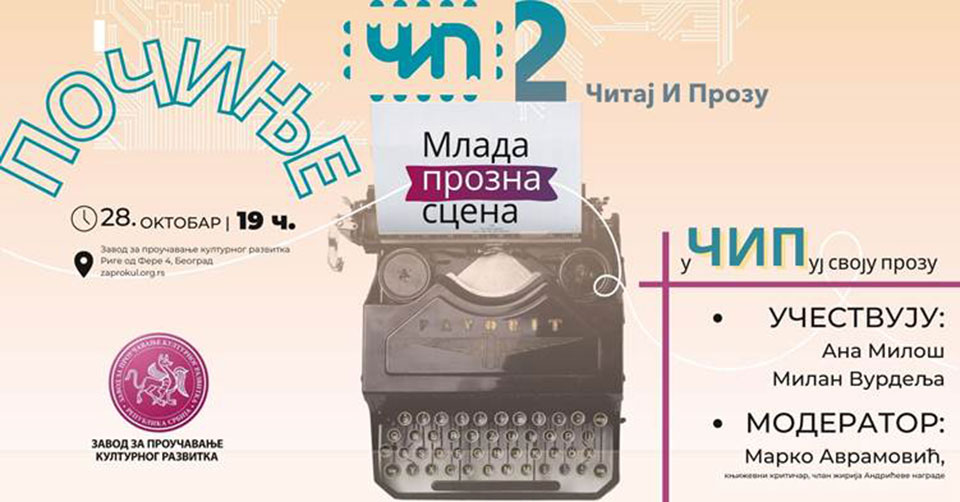 Nakon izuzetno uspešnih i veoma posećenih javnih čitanja u Zavodu za proučavanje kulturnog razvitka (Zaprokul) na kojima se publika upoznala sa mladom pesničkom scenom, druga sezona ČIP-a (ovoga puta u novom značenju Čitaj I Prozu) predstaviće kuda i gde ide mlada srpska proza. Prvi ČIP 2 održaće se 28. oktobra u 19 časova u Galeriji Zaprokula. Za razliku od mladih pesnika koji često imaju prilike da se javnim čitanjima predstave publici, grupna prozna čitanja, pogotovo mladih autora, znatno su ređa. Možda se u tome i nalazi razlog za jedan od paradoksa savremene srpske književne scene – iako je proza kod publike znatno popularnija, mladi pisci su mnogo manje prisutni i prepoznati u kulturnoj javnosti za šta su i sami odgovorni. ČIP 2 će se tradicionalno održavati jednom mesečno u Galeriji Zaprokula gde će se publika upoznati sa mladim prozaistima, a akcenat će i ovog puta biti na čitanju same proze, a ne samo na razgovoru o njoj.