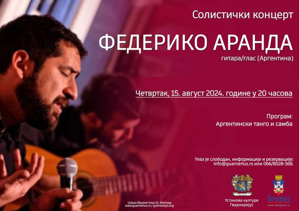 U četvrtak, 15. avgusta, s početkom u 20 časova, u Ustanovi culture Gvarnerijus koncert će održati argentinski tango pevač i gitarista Federiko Aranda. Publika će imati priliku da uživa u argentinskom tangu i sambi i vanvremenskim kompozicijama Pereire, Floresa, Rosija, Podeste, Pereza, Gardela... Federico Aranda je argentinski tango pevač, vokalni pedagog i muzičar sa bogatom i raznovrsnom muzičkom karijerom. Njegovo putovanje je počelo u prestižnom Argentinskom nacionalnom dečjem horu, gde je usavršio svoje vokalne veštine i stekao čvrste osnove muzičkog jezika. Svoju pevačku karijeru nastavlja u Narodnoj muzičkoj školi u Avellanedi, specijalizujući se za žanr tanga. Od 2018. godine postaje glavni pevač Orkestra Típica San Osvaldo, nastupajući na najistaknutijim milongama u Buenos Ajresu i širom zemlje. Poznat je po svojim strastvenim interpretacijama repertoara Osvalda Pugliesea i osvojio je srca publike u Buenos Airesu i širom Argentine.