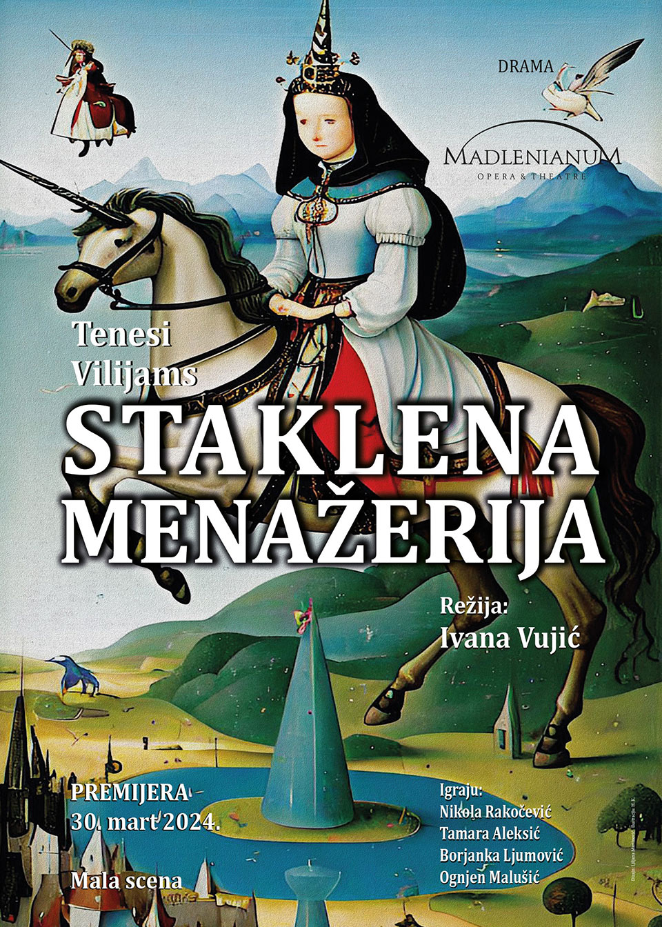 Premijera Staklene menažerije očekuje se 30. marta u 20 časova na Maloj sceni Madlenianuma, a reprize su zakazane za 1. i 13. april. Ove godine proslavlja se širom sveta 80 godina od praizvedbe drame Staklena menažerija i Madlenianum se pridružuje tom značajnom jubileju svojom premijerom ovog kultnog komada. Tim delom se proslavio jedan od zasigurno najvećih američkih dramskih pisaca, Tenesi Vilijams. Staklena menažerija je dobrim delom autobiografski komad ovog velikog autora koji pišući u prvi plan stavlja osobu nežnu poput staklene figurice, Loru Vingfild. Lorina čistota u kontekstu okruženja u kojem živi doživljava se kao osobina koja je među ljudima izumrla na način na koji su izumrli jednorozi. Ova devojka koja na najnežniji način obožava svoju kolekciju staklenih figurica, a posebno svog jednoroga, doživljava ljubavnu priču sa mladićem Džimom koji nije u stanju da dokuči visinu na kojoj je Lorina duša. Lora je skučena u svom socijalnom životu i njen svet osim staklene menažerije predstavljaju još samo njena majka Amanda i brat Tom.