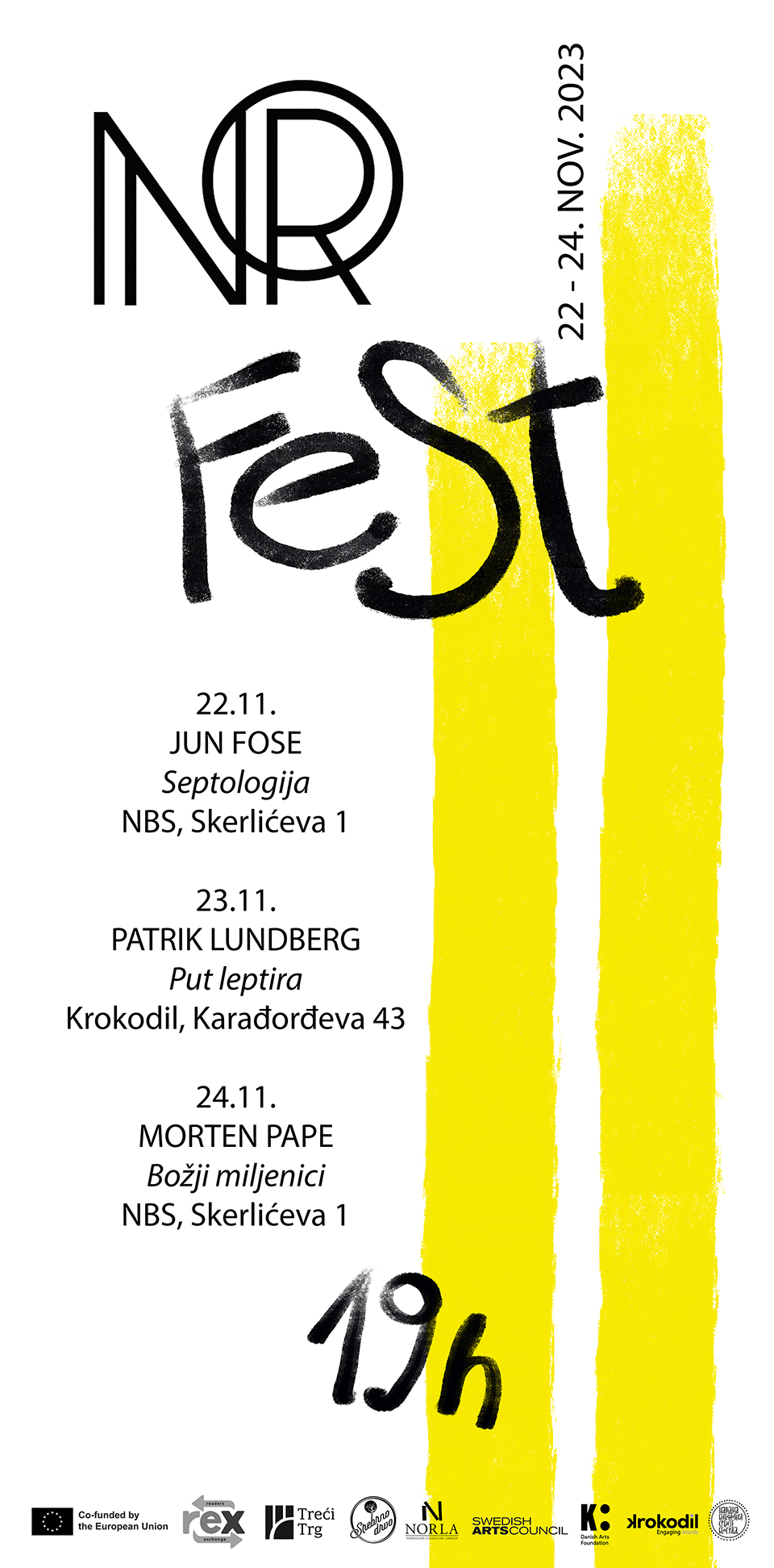 Drugi Nord festival u Beogradu održaće se od 22. do 24. novembra u Narodnoj biblioteci Srbije i Krokodilovom centru u organizaciji Trećeg Trga i Srebrnog drveta sa početkom u 19 časova. Ovogodišnji gosti festivala biće švedski pisac Patrik Lundberg i danski autor Morten Pape. Prvo veče Nord festivala, koje će se održati 22. novembra u Narodnoj biblioteci sa početkom u 19 časova otvoriće ambasadorka Norveške Kristin Melsom. Veče će biti posvećeno ovogodišnjem dobitniku Nobelove nagrade norveškom autoru Junu Foseu, a biće predstavljeno njegovo remek-delo Septologija. U razgovoru će učestovati prevodilac Radoš Kosović, Zorana Karapandžin i Dejan Matić. Švedski pisac Patrik Lundberg će narednog dana 23. novembra od 19 h u Krokodilovom centru imati promociju svog romana Put leptira. Program će otvoriti švedska ambasadorka Annika Ben David, a sa autorom će razgovarati prevoditeljke Svetlana Tot i Marija Rakić i Dejan Matić.