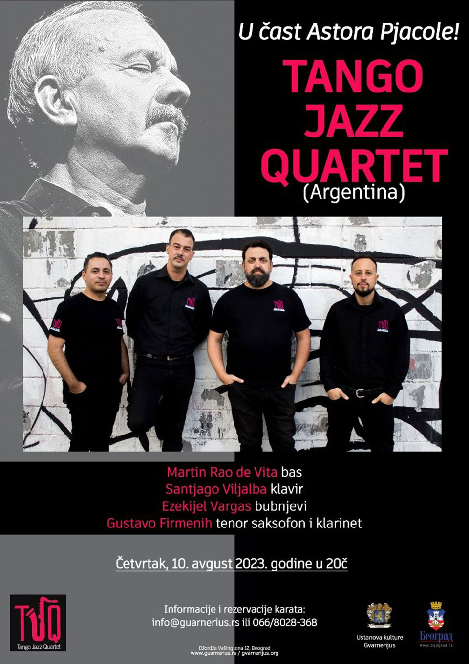 Sjajni umetnici iz Argentine, Tango Džez kvartet, održaće koncert 10. avgusta (20č) u Ustanovi kulture Gvarnerijus, u čast čuvenog kompozitora Astora Pjacole i beogradskoj publici izvesti dela Četiri godišnja doba u Buenos Ajresu i Suite Troileana. Ovaj sastav kombinuje melodijske i ritmičke obrasce tanga sa harmonijom i improvizacijom džeza, i svojim nastupima nailazi na oduševljenje publike, kako u Argentini tako i na međunarodnom nivou. Repertoar kvarteta kreće se od tradicionalnog tanga do muzike Astora Pjacole, a da zapravo nikada ne napušta “teritoriju” džeza. U okviru 26 izvedenih međunarodnih turneja, u više od 30 zemalja, Tango Džez kvartet (TJQ) zauzeo je istaknuto mesto na svetskoj muzičkoj sceni, nastupajući širom Evrope, Sjedinjenih Američkih Država, Brazila, Afrike, Rusije i Kine. Sve je počelo kada je saksofonista i klarinetista Gustavo Firmenih, vođa Tango Džez kvarteta, oživeo plesne večeri koje su bile uobičajene u zlatnoj eri tanga u Buenos Ajresu, u kojoj su tango i džez “živeli” zajedno, ali su svirani odvojeno. Tango Džez kvartet predložio je spoj zajedničkog za oba muzička pravca i dodao ono što je karakteristično za džez a što tangu nedostaje – improvizaciju.