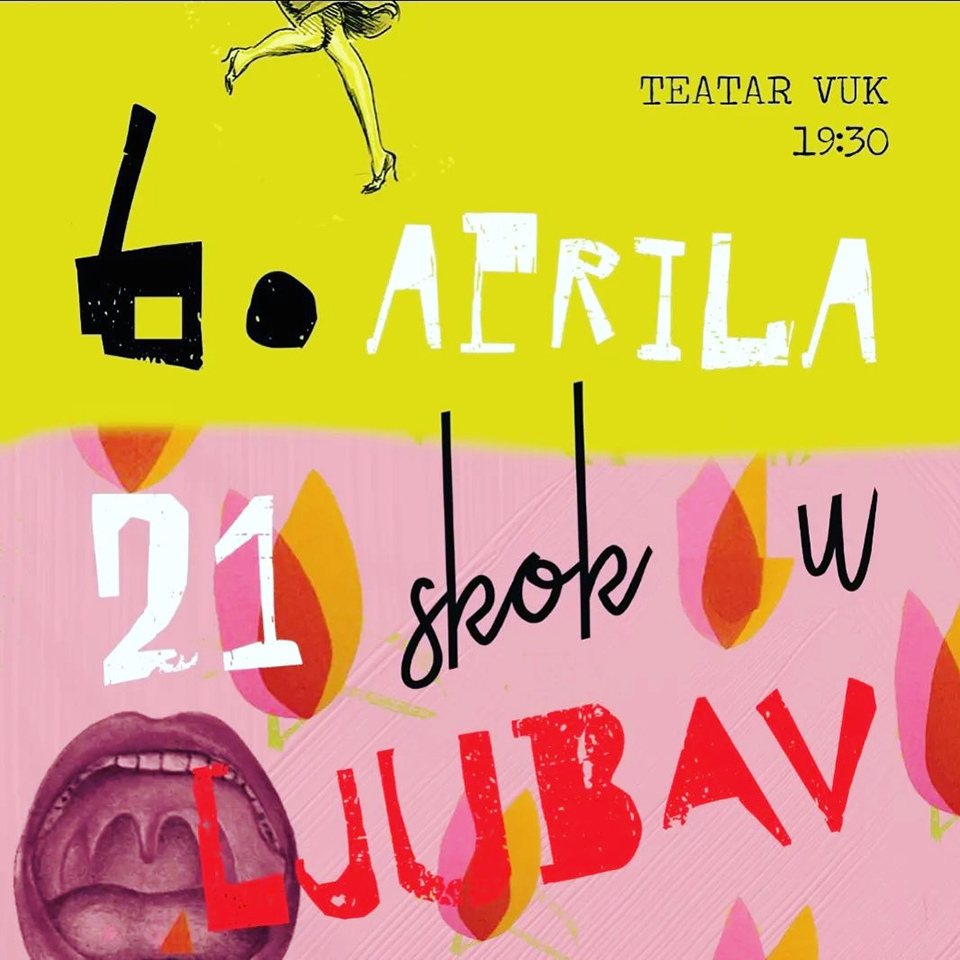 Naredno izvođenje predstave ,,21 skok u ljubav” Dine Radoman zakazano je za 6. april u Vuk teatru na sceni ,,Kult” s početkom u 19:30h. Predstava sastavljena od 51 pesme 21 pesnika, predstavlja urbanu priču o ljubavi i unutrašnjim putovanjima namenjena gledaocima svih generacija! Dina Radoman, pozorišna rediteljka i vizuelna umetnica. Pozorište oseća kao svoj centar. Osluškuje fantazije, svoje i tuđe. Eksperimentiše. Razmišlja o prostoru: fizičkom, mentalnom, prostoru poezije, prostoru kao nosiocu emocije. Poslednjih godina zaokupljena je poezijom i putevima kojima ona prelazi u druge umetničke forme: teatar, fotografiju, ples, performans, instalaciju. Sa studentima kojima je na Novoj akademiji predavala Scenski dizajn istraživala je – Kako poezija postaje prostor?
