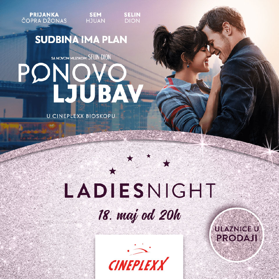 U četvrtak, 18. maja od 20 časova u Cineplexx bioskopima očekuje vas najnoviji Ladies night događaj uz film „Ponovo ljubav“. Za sve ljubitelje romantičnih komedija stiže prava poslastica sa Prijankom Džoprom Džonas i Semom Hjuanom u glavnim ulogama, a na velikom platnu imaćemo priliku da gledamo i muzičku legendu Selin Dion. Šta ako vas poruka sa nepoznatog broja dovede do ljubavi tvog života? U ovoj romantičnoj komediji, suočena sa gubitkom svog verenika, Mira Rej stalno šalje romantične poruke na broj njegovog starog telefona… ne znajući da je taj broj povezan sa telefonom koji poseduje Rob Berns. Novinar, Rob je očaran iskrenošću u prelepo ispisanim tekstovima. Kada je dobio zadatak da napiše članak o velikoj zvezdi Selin Dion (koja glumi samu sebe u svojoj prvoj filmskoj ulozi), Rob traži njenu pomoć da pronađe način da lično upozna Miru… i osvoji njeno srce. Pored sjajne filmske priče i glumaca, za sve posetioce Ladies night događaja pripremili smo i piće dobrodošlice.