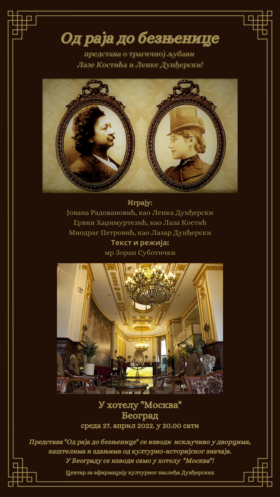 Predstavom "Od raja do beznjenice", Centar za afirmaciju kulturne baštine Dunđerskih iz Bečeja, u saradnji sa hotelom "Moskva", počinje akciju upoznavanja beogradske publike sa značajem Dunđerskih - najmoćnije i najbogatije srpske porodice u austrougarskoj monarhiji. Centralno mesto ovog programa čini upravo predstava o velikoj ljubavnoj drami između Laze Kostića i Lenke Dunđerski. "Od raja do beznjenice" /beznjenica - kovanica Laze Kostića koja označava život bez nje/ je drama o velikoj ljubavi najvećeg pesnika srpskog romantizma Laze Kostića i Lenke Dunđerski, kćeri najmoćnijeg i najbogatijeg Srbina u Austrougarskoj carevini - Lazara Dunđerskog! Arhitektura, enterijer, istorijski značaj hotela "Moskve" pokazao se kao srećno rešenje da se predstava izvede i u Beogradu - 27. aprila u 20.00 sati.
