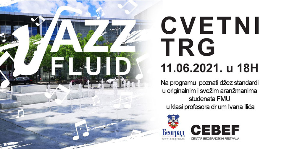 U okviru projekta grada Beograda „Urbanizacija kroz kulturu“ u saradnji sa Centrom beogradskih festivala CEBEF-om, koji već drugu godinu nove javne prostore oblikuje kulturnim sadržajem, ovog petka, 11. juna, sa početkom u 18 časova, gradska urbana oaza Cvetni trg će postati svojevrsna džez pozornica. Koncertom pod nazivom „Džez fluid“, predstaviće se mladi umetnici, tačnije studenti Fakulteta muzičkih umetnosti sa programom poznatih džez standarda u originalnim i svežim aranžmanima. Ulaz na koncert je besplatan! Na koncertu nastupaju: Lilien Ožvar, vokal; Nemanja Banović, truba; Petar Pitarević, klavir; Vukan Potežica, kontrabas; Petar Janković, alt saksofon; Bojan Božanović, vokal; Kosta Jovanović, gitara; Miroslav Šarbanović, kontrabas iMarko Remenjak, bubnjevi.