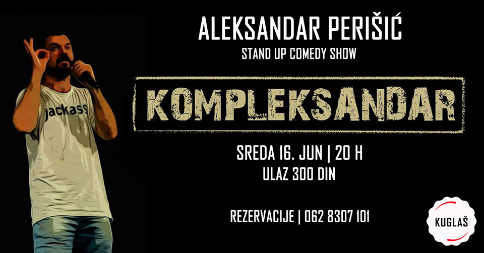 Komičar Aleksandar Perišić će prvi put u klubu Kuglaš izvesti svoj stand up show „Kompleksandar“ u sredu, 16. juna od 20 sati. Stariji a ništa pametniji. Vakcinisan, ali i dalje slab iz matematike. Duhovit, ukoliko nije zaboravio kako je stajati pred ljudima i pričati. Sa svojom predstavom „Kompleksandar“, rešio da malo dublje zakopa po sebi i sa publikom podeli i lične nesigurnosti. Ali i dalje laže kao pas. Svratite i razlučite šta je šta! Nastupi Aleksandra Perišića su uvek rasprodati, zato, rezervišite svoje mesto na vreme, na broj 062 8307 101. Ulaz na veče stand up komedije „Kompleksandar“ u Kuglašu je 300 dinara.