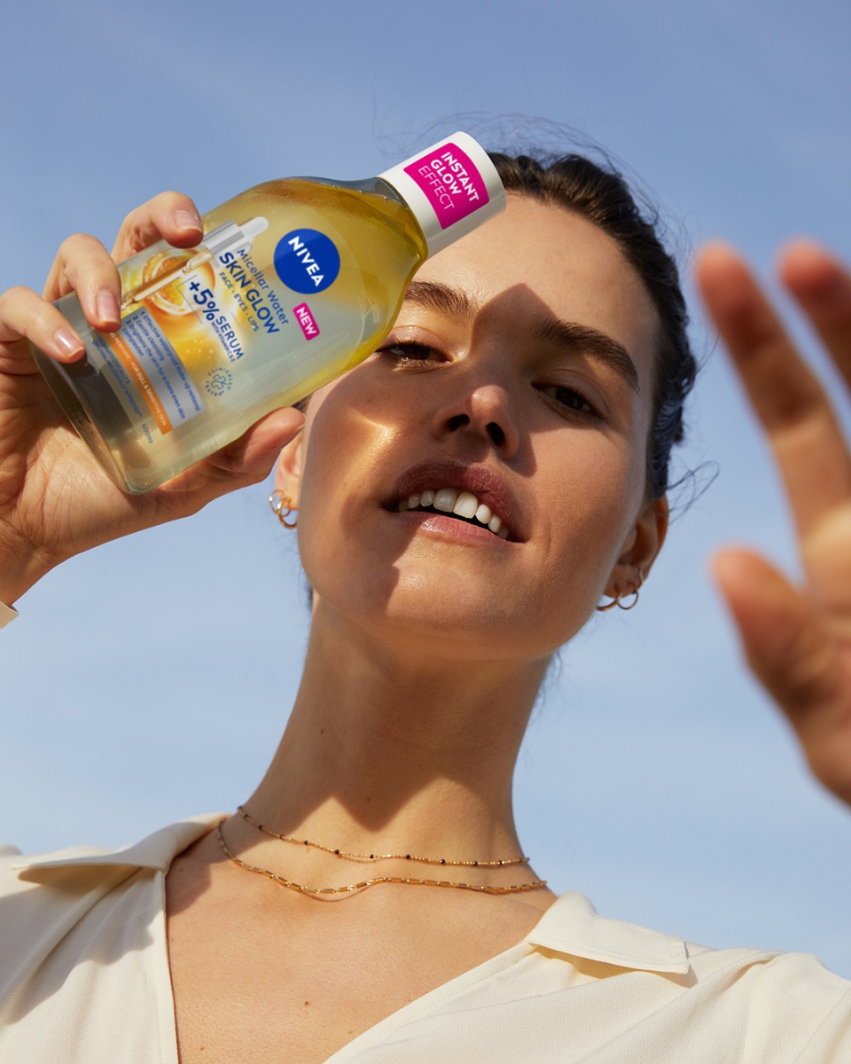 Žene svakodnevno vode bitku same sa sobom kako bi pronašle ono što najviše odgovara njihovoj koži da zasija. Pri tom, većina zaboravlja ili nije svesna da je put do sjaja jednostavan i brz, a prvi korak je čišćenje lica! Započnite dan sa osećajem na koži ispunjenom energijom zahvaljujući dubinskom i osvežavajućem čišćenju uz NIVEA Skin Glow micelarnu vodu obogaćenu sa 5 % seruma koji sadrži vitamine C i E, kao i kompleks aminokiselina. U samo nekoliko nežnih poteza, bez trljanja, temeljno će ukloniti vodootpornu šminku, prljavštinu i nečistoće, pri tom ne ostavljajući masne tragove. NIVEA Skin Glow micelarna voda za beživotnu i osetljivu kožu efikasno uklanja vodootpornu šminku i nečistoće u samo nekoliko laganih poteza. Čini kožu svetlijom, hidrira i pruža ujednačen i blistav ten. Otkrijte tajnu jutarnjeg sjaja uz NIVEA Skin Glow micelarnu vodu i uživajte u dubinski očišćenoj i vidljivo blistavoj koži!