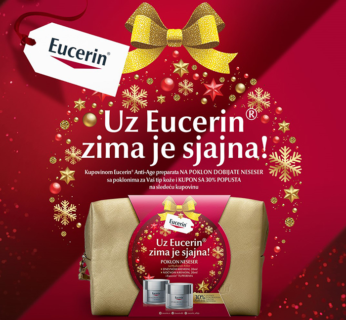 UZ EUCERIN® ZIMA JE SJAJNA - U okviru već omiljene akcije Uz Eucerin® zima je sjajna, tokom decembra u bolje snabdevenim apotekama uz kupovinu Eucerin® anti-age preparata na poklon dobijate neseser sa mini pakovanjima Eucerin® anti-age krema i kupon sa 30% popusta na sledeću kupovinu jednog Eucerin® anti-age preparata.