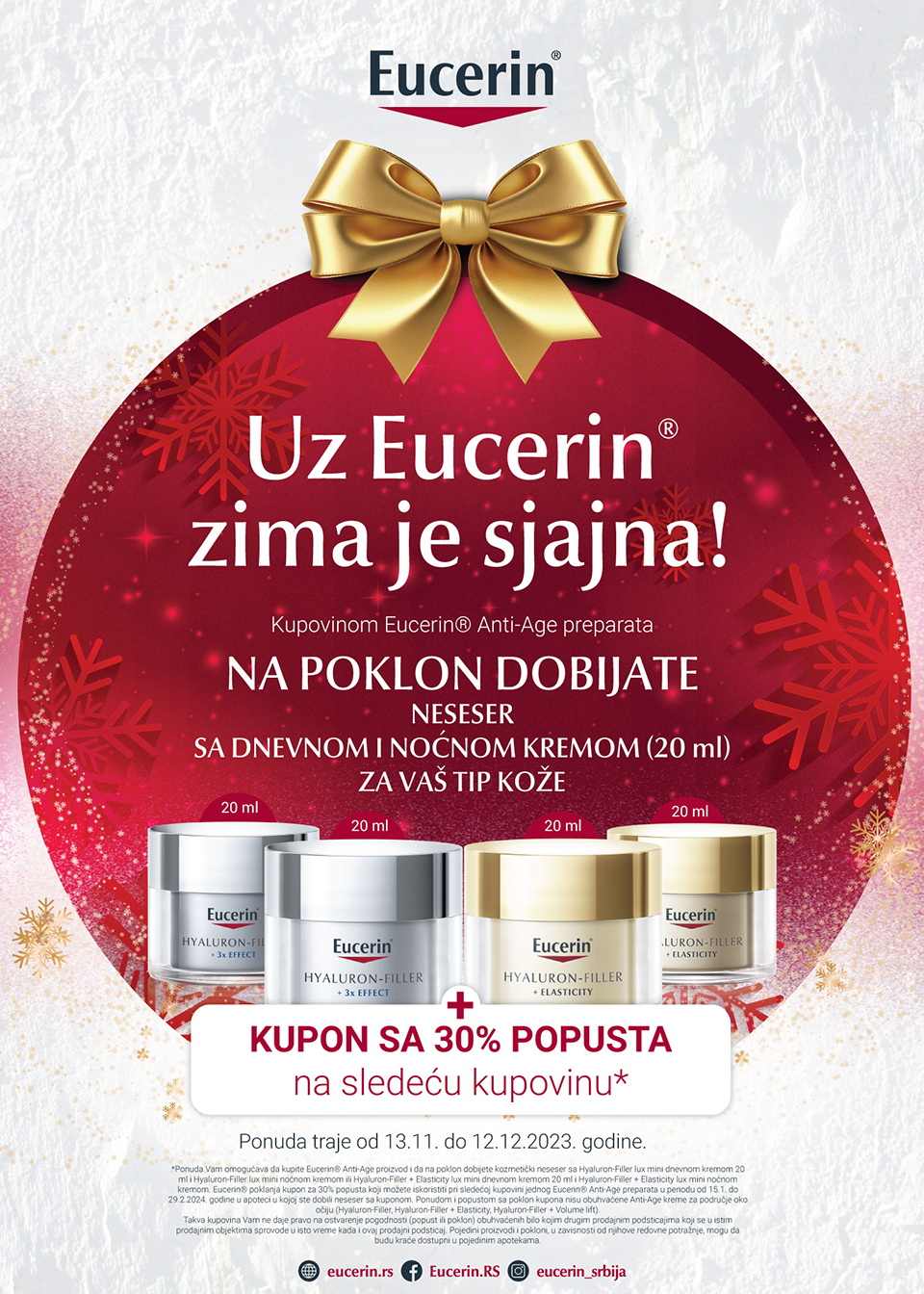 Neseser koji dobijate u Eucerin® partner apotekama uz kupovinu Eucerin® anti-age preparata sadrži mini lux pakovanja od 20ml krema za dan i noć iz Eucerin® Hyaluron-Filler i Eucerin® Hyaluron-Filler+ Elasticity linija. Kupon sa 30% popusta na kupovinu narednog anti-age preparata možete iskoristiti u periodu od 15. januara do 29. februara 2024.godine. Popust se ne može primeniti na preraparate čija je cena već snižena i specijalna pakovanja. Ovom ponudom i popustom nisu obuhvaćeni Eucerin® anti-age kreme za negu područja oko očiju.