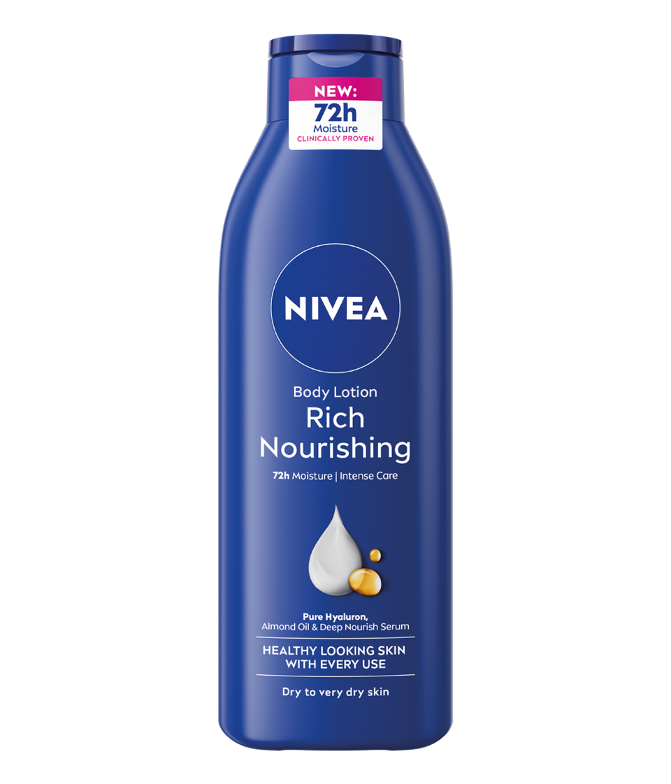 Niske temperature, vetar, suv vazduh, pa čak i svakodnevno tuširanje, kožu mogu učiniti vrlo suvom. Zato je u hladnijim danima važno posvetiti malo više pažnje nezi naše kože jer kada je ona negovana i zdrava, i mi ćemo se dobro osećati u njoj. NIVEA to zna i zato nam predstavlja novu, unapređenu formulaciju NIVEA mleka za telo, sada obogaćenu 100 % čistom hijaluronskom kiselinom, prirodnim bademovim uljem i serumom koji će vam osigurati zdrav izgled kože uz duboku i dugotrajnu hidraciju. NIVEA legendarno plavo mleko za telo je više od 60 godina sinonim za bogatu negu suve kože, a sada vam predstavlja novu inovativnu formulu koja pruža klinički dokazanu 72-časovnu hidrataciju. S trenutnim i dugotrajnim rezultatima, nova formula NIVEA mleka za telo osmišljena je da ti pruži prelepu i zdravu kožu i pobrine se za dobar osećaj i samopouzdanje koje se vidi.