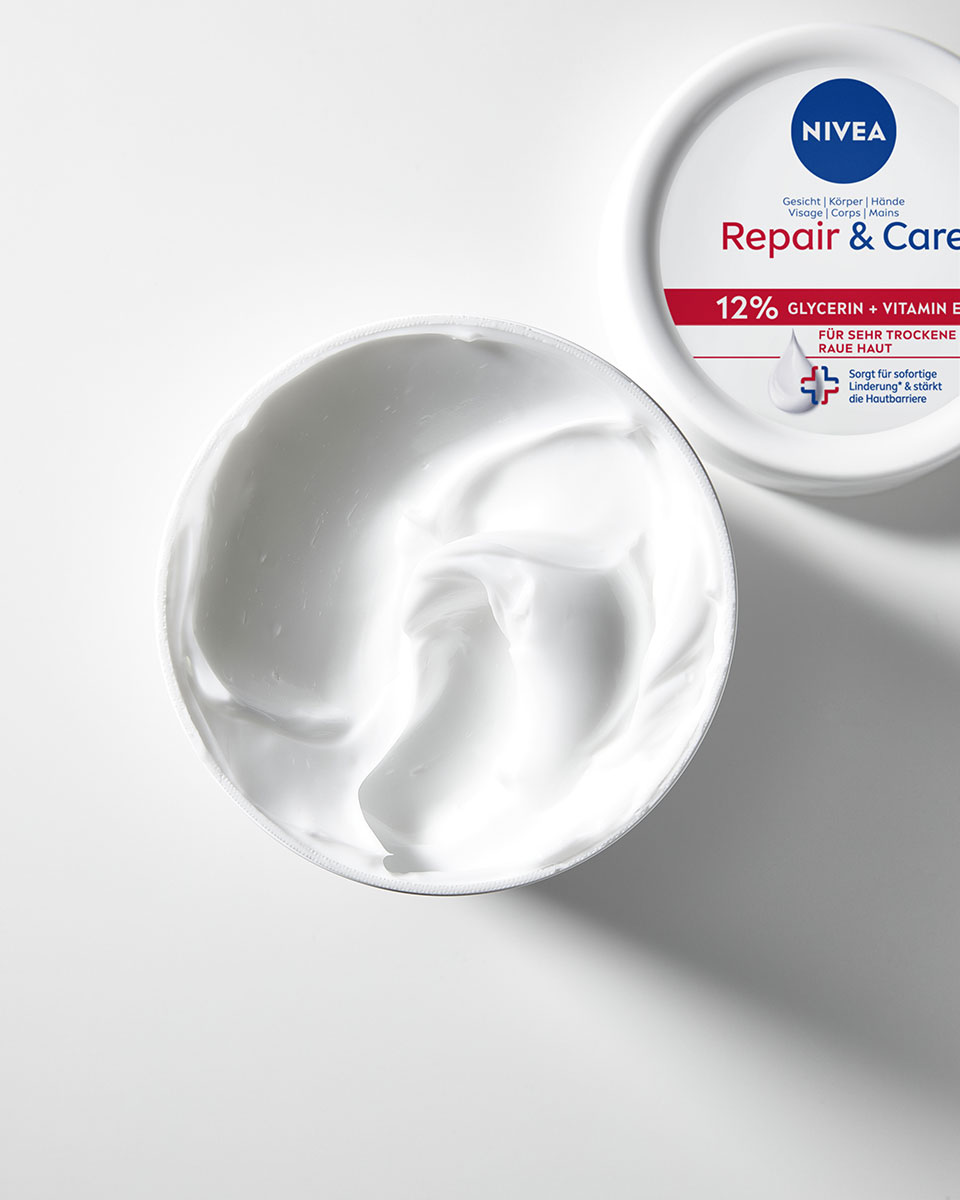 Postoji mnogo lekcija o lepoti, ali sve dele isti princip: svi želimo da se u svojoj koži osećamo dobro, a osnovni preduslov za to je zdrava i hidrirana koža. Međutim, to nije lako postići. Iako svi želimo da ona bude glatka i nežna, mnogi ljudi pate od hrapave, osetljive i suve kože sklone iritaciji i često se suočavaju s crvenilom i iritacijama. Odahnite, NIVEA vam donosi rešenje za osećaj zdrave i primetno mekše kože. Zahvaljujući posebnoj kombinaciji sastojaka glicerina, pantenola, ulja i vitamina E, formule linije Repair & Care pružiće intenzivnu hidrataciju vašoj osetljivoj koži i podržati njenu barijeru. Visokoefikasna i obnavljajuća nega sada je dostupna u dvema kombinacijama aktivnih sastojaka kako bi ciljano ublažila probleme s kojima se vaša osetljiva koža suočava. Uklonite neprijatan osećaj hrapave i zategnute kože uz NIVEA Repair & Care univerzalnu kremu za vrlo suvu kožu. Ova negujuća krema će vam pružiti dugotrajnu intenzivnu hidraciju koja traje do 72 sata, kao i bogatu negu koja će vašu kožu učiniti prijatno mekom i glatkom.