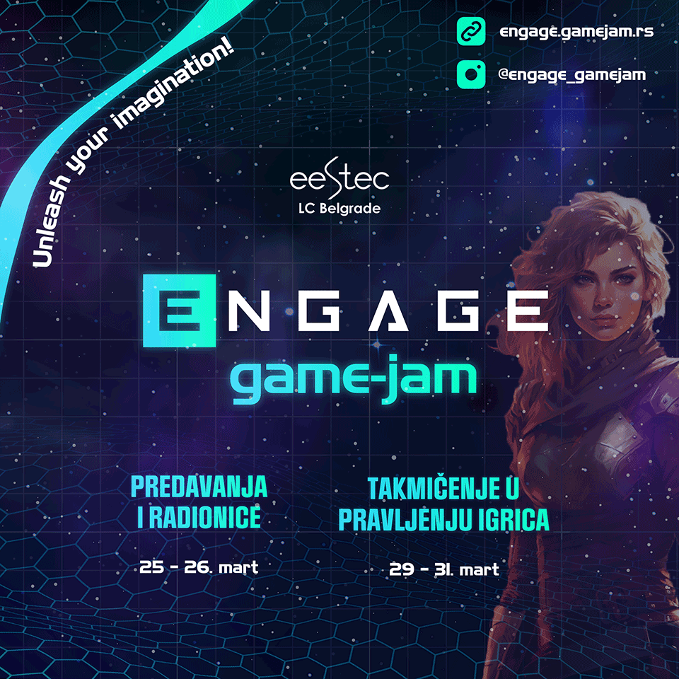 Udruženje studenata elektrotehnike Evrope - Lokalni Komitet Beograd (EESTEC LC Belgrade) po prvi put organizuje projekat “ENGAGE GameJam”, koji se ove godine održava od 25.3.-31.3.2024. Cilj ENGAGE GameJam-a jeste da studente kojima je razvoj video igara zanimljiv motiviše da se u njemu i oprobaju. Učensicima će biti dostupni resursi potrebni za rad, kao što su 3D modeli i mehanike neophodne da se napravi jedna video igra. Jedina, takmičarima neophodna stvar, jeste mašta, koju preporučujemo da ponesu sa sobom. Izazov sa kojim će se učesnici ENGAGE-a susreti jeste da naprave video igru na već zadatu temu u periodu od 48h, počevši od 29.marta sve do 31. marta. Za ovo takmičenje se mogu prijaviti svi studenti zainteresovani za razvoj video igara, bez obzira na prethodno znanje.