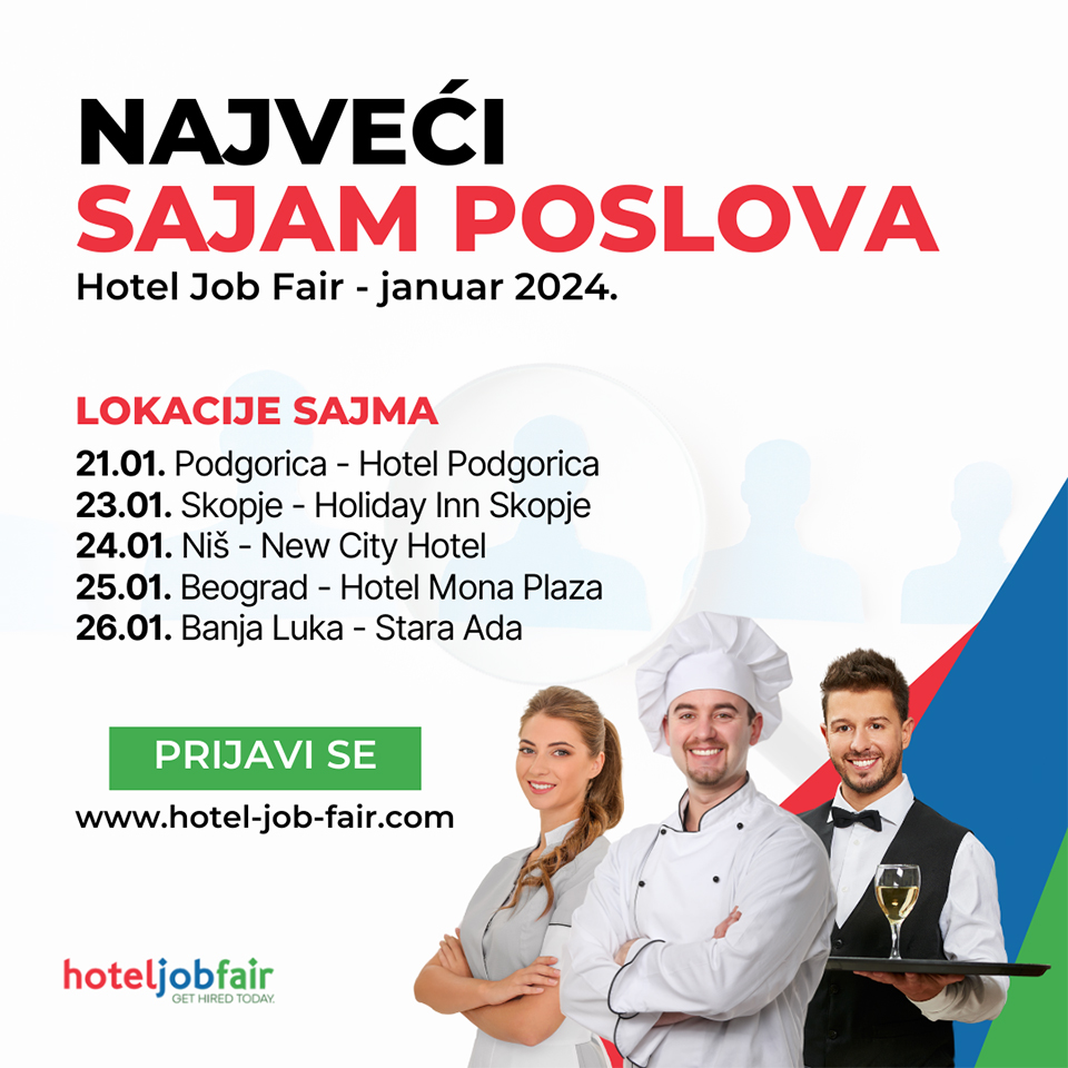 Hotel Job Fair nije samo sajam zapošljavanja; to je događaj gde se spajaju kandidati zainteresovani za hotelijerske pozicije i najprestižniji hotelski brendovi. Sajam pruža kandidatima priliku da iz prve ruke stupe u kontakt sa vodećim poslodavcima, otvarajući vrata ne samo za sezonska zaposlenja, već i za dugoročne karijerne prilike. Za hotelske kuće, Hotel Job Fair predstavlja izuzetnu priliku za predstavljanje svog brenda i privlačenje novih talenata. Učestvovanjem na sajmu, hoteli mogu efikasno i brzo popuniti svoje timove, kao i smanjiti troškove zapošljavanja. Ovaj događaj, koji iz godine u godinu postavlja nove standarde, ove godine obilazi 5 ključnih gradova iz regiona i privlači više od 20 renomiranih hotelskih kuća koji će svim zainteresovanim kandidatima predstaviti svoje otvorene pozicije i uslove rada. Januar 2024. godine obećava da će biti uzbudljiv za sve kandidate koji žele raditi u hotelima širom regiona, sa nadolazećim Hotel Job Fair-om koji će se održati u pet ključnih gradova: