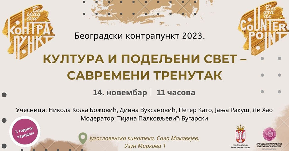 Sedmi BEOGRADSKI KONTRAPUNKT, koji ove godine nosi naziv KULTURA I PODELJENI SVET – SAVREMENI TRENUTAK, održaće se u sredu, 15. novembra 2023. godine, u Jugoslovenskoj kinoteci (Sala Makavejev, Uzun Mirkova 1), sa početkom u 11 časova. „Beogradski kontrapunkt“ u organizaciji Ministarstva kulture Republike Srbije kao pokretača i Zavoda za proučavanje kulturnog razvitka kao realizatora je međunarodni skup čiji je cilj da okupi umetnike i mislioce iz različitih delova sveta. Savremeni trenutak u svetu obeležavaju brojni izazovi, poput ratnih sukoba, transhumanizma, socijalne i ekonomske krize velikih razmera, prevlasti materijalnih vrednosti, moralnog relativizma i utilitarizma, potrošačke svesti i naizgled nepomirljivo suprotstavljenih interesa između različitih država i centara moći.