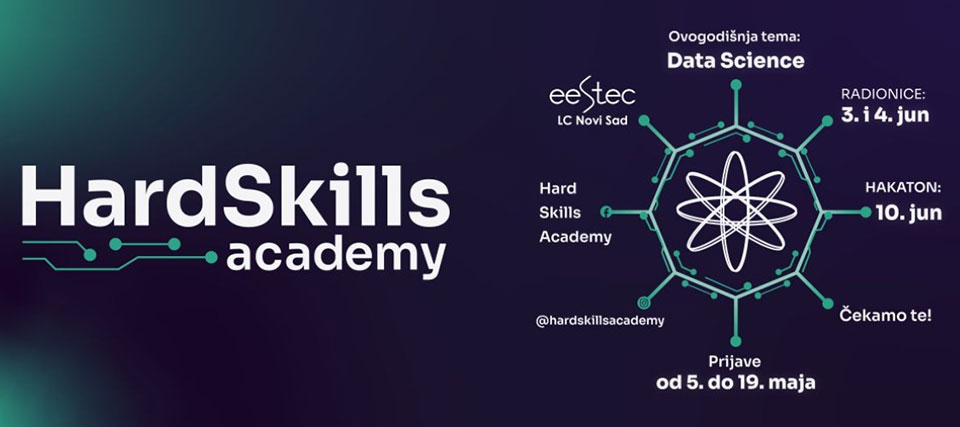Hard Skills Academy - Akademija tvrdih veština je projekat koji EESTEC LC Novi Sad organizuje po prvi put ove godine sa ciljem da studentima pruži priliku unapređenja veština iz stručnih oblasti potrebnih za rad u različitim industrijama. Studenti će posle pohađanja Akademije steći relevantna praktična znanja i samim tim postati konkurentniji na tržištu rada. Akademija će se realizovati u vidu dvodnevnih radionice 3. i 4. juna, zaključno sa hakatonom koji će biti održan 10. juna. Planirano je da akademiju pohađa 20 polaznika. Tema koja će se ove godine obrađivati na akademiji je Data Science. Za dva dana radionica stručni predavači će sprovesti studente kroz kompletan proces Data Science Lifecycle-a i tako ih upoznaju sa ključnim metodologijama i konceptima neophodnih za uspešan rad u data science-u. Učesnici će naučiti kako da prikupe, selektuju, organizuju, analiziraju i obrade podatke, te kako da predstave svoje rezultate na najbolji mogući način. Nakon predavanja, učesnici će se podeliti u timove i dobiće podatke koje će obrađivati u periodu do hakatona.
