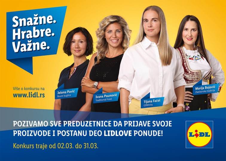 U susret Međunarodnom danu žena, kompanija Lidl Srbija je i ove godine raspisala konkurs „Snažne. Hrabre. Važne.“ koji za cilj ima jačanje položaja žena u poslovnom svetu u Srbiji i promovisanje njihovih proizvoda. Konkurs traje do 31. marta, do kada sve zainteresovane preduzetnice mogu da se prijave kako bi se njihovi proizvodi našli u ponudi u okviru jedne tematske nedelje u preko 65 Lidl prodavnica u Srbiji. Pravo na učešće u konkursu imaju preduzetnice, privredna društva, registrovana poljoprivredna gazdinstva u Srbiji koja se bave proizvodnjom iz segmenta hrane, dodataka prehrani ili kozmetike – proizvoda za negu i lepotu – čiji su vlasnici u potpunosti žene. Sve zainteresovane preduzetnice o detaljima učešća na konkursu i načinu prijave mogu se informisati na zvaničnom sajtu kompanije www.lidl.rs.