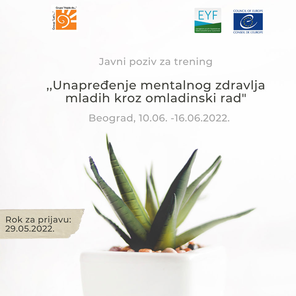 Javni poziv za učešće na treningu prepoznavanja pokazatelja teškoća u mentalnom zdravlju i pružanja prve podrške mladima u riziku, realizovanja obuka i drugih neformalnih edukativnih aktivnosti u cilju prevencije mentalnog zdravlja, ukazivanja na diskriminaciju mladih sa problemima u oblasti mentalnog zdravlja, informisanja o tome koje još sisteme podrške mladi mogu da pronađu.Tokom trajanja treninga, učesnici/ce će imati priliku da steknu i unaprede znanja u oblasti prepoznavanja pokazatelja teškoća u mentalnom zdravlju, pružanja prve podrške mladima u riziku, realizovanja obuka i drugih neformalnih edukativnih aktivnosti i ukazivanja na diskriminaciju mladih sa problemima u oblasti mentalnog zdravlja. Učešće na projektu je besplatno, a odabrani učesnici/ce imaće podršku mentora – psihoterapeuta sa višegodišnjim iskustvom u radu sa mladima, pri realizaciji radionica za mlade na temu mentalnog zdravlja u njihovim lokalnim zajednicama.