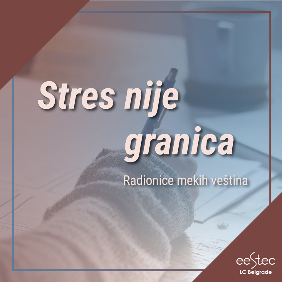 Ove godine Udruženje studenata elektrotehnike Evrope - Lokalni komitet Beograd (EESTEC LC Belgrade) je došlo na ideju da kroz niz interaktivnih treninga pomogne studentima da srećniji i sa manje stresa prođu kroz fakuletetsku godinu. Sa zadovoljstvom Vas obaveštavamo da se u novembru ove godine organizuju besplatne radionice ličnih i profesionalnih veština „Stres nije granica“ za sve zainteresovane studente Univerziteta u Beogradu! Radionice se održavaju uživo (ukoliko to epidemiološka situacija dozvoli), 6. novembra 2021. godine i prisustvovaćeim odabranih 40 studenata. "Znamo da je danas i sa fakultetskom diplomom jako teško naći posao. Konkurencije je mnogo jer se mladi sve više angažuju, i svako znanje je od koristi. Radionica mekih veština pruža priliku studentima da saznaju nešto što ih neće niko naučiti na fakultetima, što će im pomoći da, sa minimalnom dozom stresa, završe svoje školovanje, a po čemu će imati priliku da se istaknu.