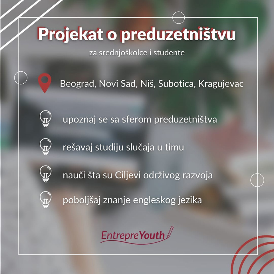 Ukoliko još uvek planiraš šta ćeš raditi za leto, obeleži period od 12.7. do 15.8. u kalendaru. Radi na sebi, upoznaj nove ljude i ojačaj start up zajednicu u Srbiji! Sve više mladih bi volelo da pokrene neki svoj biznis i upliva u preduzetničke vode. Zato AIESEC organizuje “EntrepreYouth” projekat i ovog leta sa ciljem da studentima prve i druge godine studija, kao i srednjoškolcima završnih godina pruži neophodna znanja i veštine koje su im potrebni da pokrenu sopstveni biznis i otkriju preduzetnički svet kroz studiju slučaja i različite radionice. Radionice se realizuju na engleskom jeziku, jer će pri rešavanju studije slučaja mladi biti podeljeni u timove koji će voditi inostrani studenti. Projekat je namenjen studentima prve i druge godine studija, kao i srednjoškolcima završnih godina. Očekujte pet nedelja radionica i rešavanje studije slučaja koja je blisko povezana sa Ciljevima održivog razvoja.