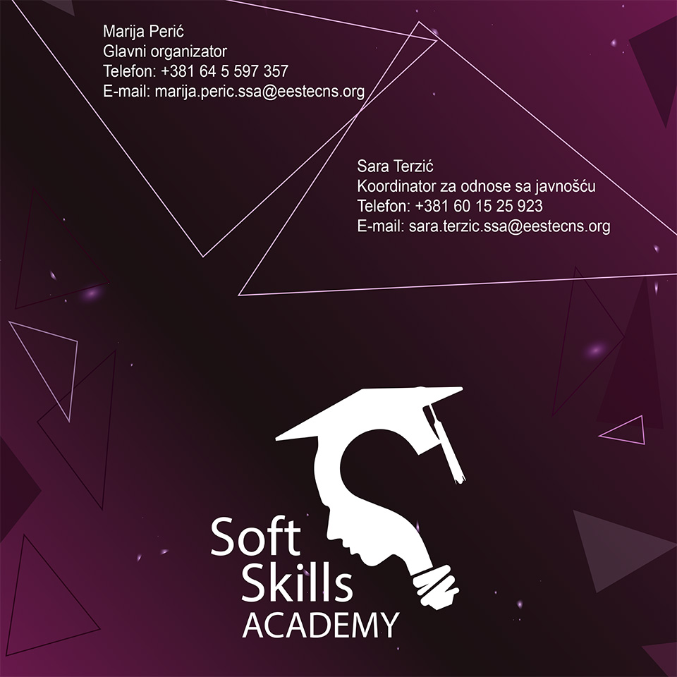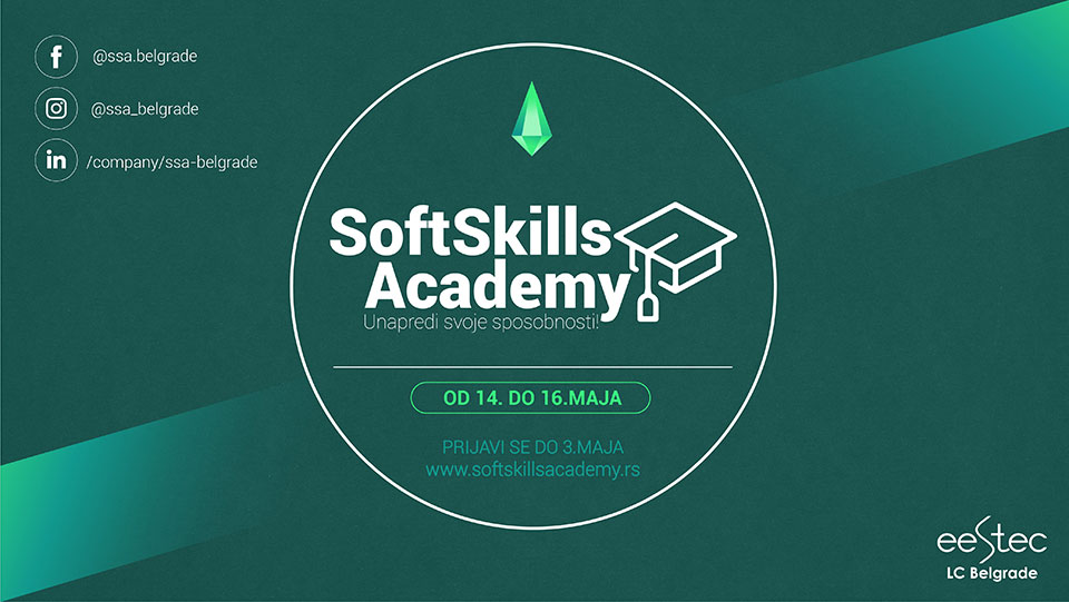 U 2010. godini Udruženje studenata elektrotehnike Evrope - Lokalni komitet Beograd je došlo na ideju da kroz niz interaktivnih treninga omogući studentima da se bolje opreme za uspešnu karijeru. Tokom godina, razni komiteti našeg Udruženja su prepoznali važnost veština koje Soft Skills Academy pruža, tako da se danas ovaj seminar održava u 18 evropskih gradova. Ove godine organizuje besplatan seminar ličnih i profesionalnih veština „Soft Skills Academy“ za sve zainteresovane studente, u digitalnom izdanju! Seminar se održava u periodu od 14. do 16. maja 2021. godine. Udruženje, već dug niz godina, organizuje seminar “Soft Skills Academy” sa ciljem da ambicioznim studentima pruži priliku da poboljšaju neophodne profesionalne veštine koje ne dotičemo tokom formalnog obrazovanja. Kako zbog trenutne epidemiološke situacije niko nije u mogućnosti da se okupi uživo, jedanaest godina tradicije nastavlja se uz pomoć modernih sredstava komunikacije.