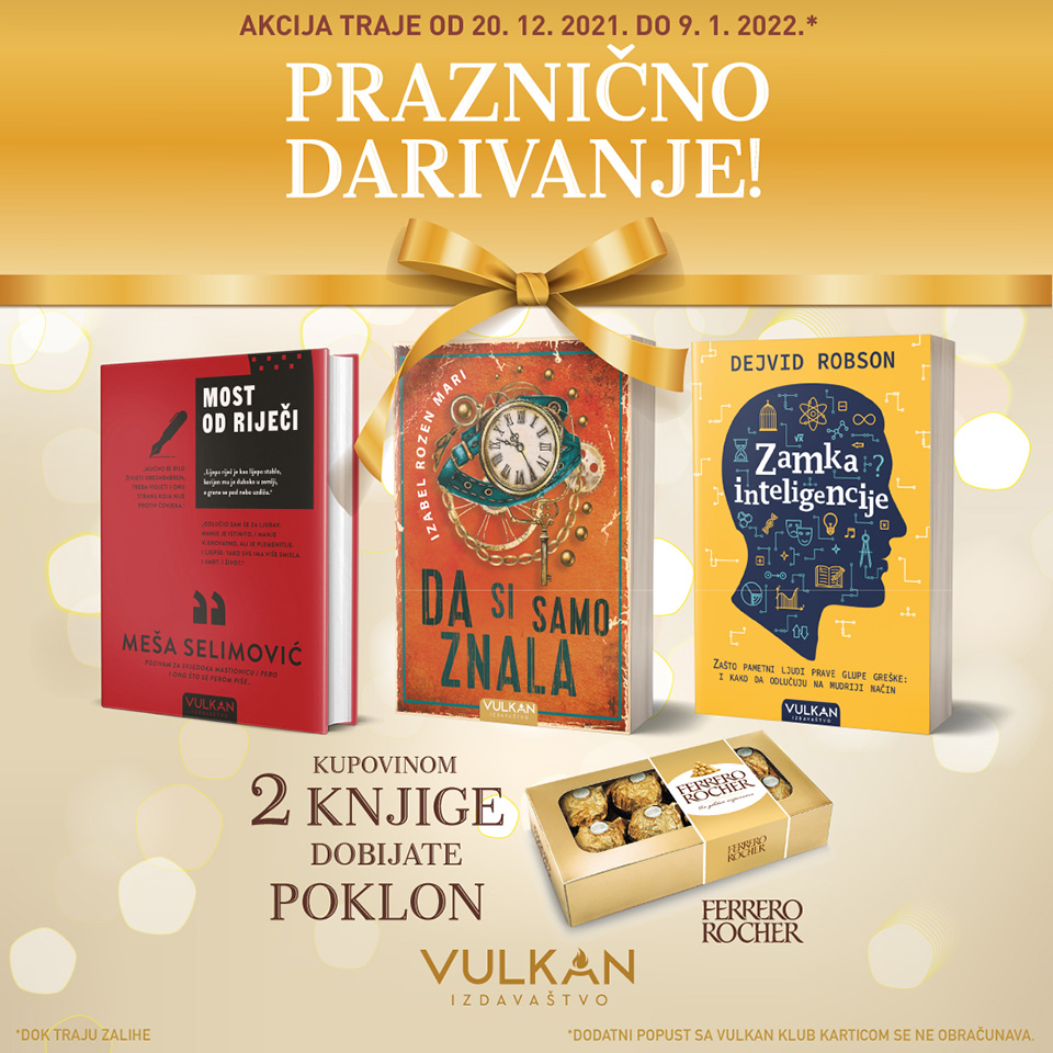 U decembru, mesecu praznika i darivanja, Vulkan izdavaštvo i Ferrero Rocher spremili su fantastičnu poklon-akciju! U svim Vulkan knjižarama širom Srbije, kupovinom dve od tri praznične knjige Vulkan izdavaštva dobijate na poklon Ferrero Rocher slatko zadovoljstvo. Velika praznična akcija traje od 20. decembra 2021. do 9. januara 2022. godine. Naši čitaoci imaće priliku da uz sjajne, odabrane praznične naslove Vulkan izdavaštva uživaju u neponovljivom ukusu Ferrero Rocher kugli. Vulkan izdavaštvo je pripremilo tri fantastična naslova. Roman Da si samo znala autorke Izabel Rozen Mari pravi je izbor za sve one koji vole uzbudljivu kombinaciju romanse i napetosti.