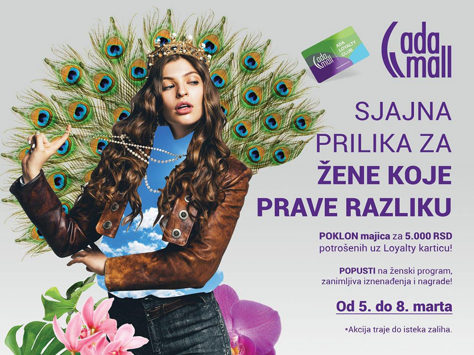 Suprotno verovanju da je ovo svet kojim dominiraju muškarci, žene su te koje pružaju osnovu moći, milosti, mudrosti, pravde, kreativnosti i nade. Poznato je da žene imaju bolju intuiciju, strpljenje, emocionalni fokus, saosećanje i sposobnost umrežavanja. Lista ženskih prednosti je beskrajna. Mart je mesec u kojem simbolično slavimo ženu. U Ada Mall-u, od 5. do 8. marta tim povodom vas očekuju specijalni popusti na kupovinu artikala iz ženskog programa, dok za kupovine preko 5,000 RSD uz loyalty karticu na poklon dobijate brendiranu majicu.