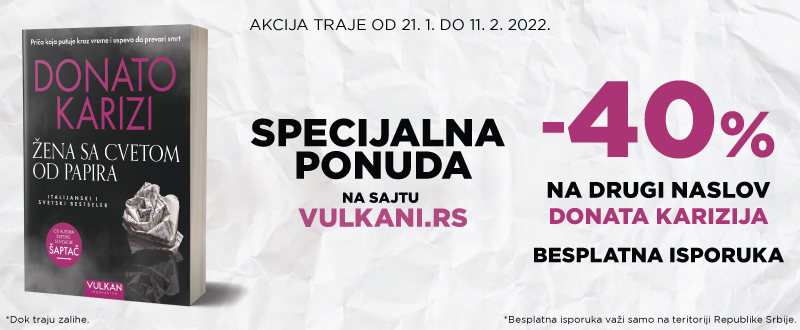 Iz Vulkan izdavaštva stižu sjajne vesti za sve one koji su s nestrpljenjem iščekivali objavljivanje romana Žena sa cvetom od papira čuvenog Donata Karizija! Knjiga kojom je Karizi započeo svoju blistavu karijeru pisca od danas je u prodaji na sajtu vulkani.rs! Ova nezaboravna, poetična i uzbudljiva priča pokazuje nam kako reč, ako se izrazi, može promeniti tok života. Istorija, potonuće Titanika, strast, ljubav, melanholija stapaju se u svojevrsnom kaleidoskopu punom sugestija i intenzivnih emocija. Reči teku i prepliću se kao oblaci dima, a dim je upravo lajtmotiv čitavog romana.