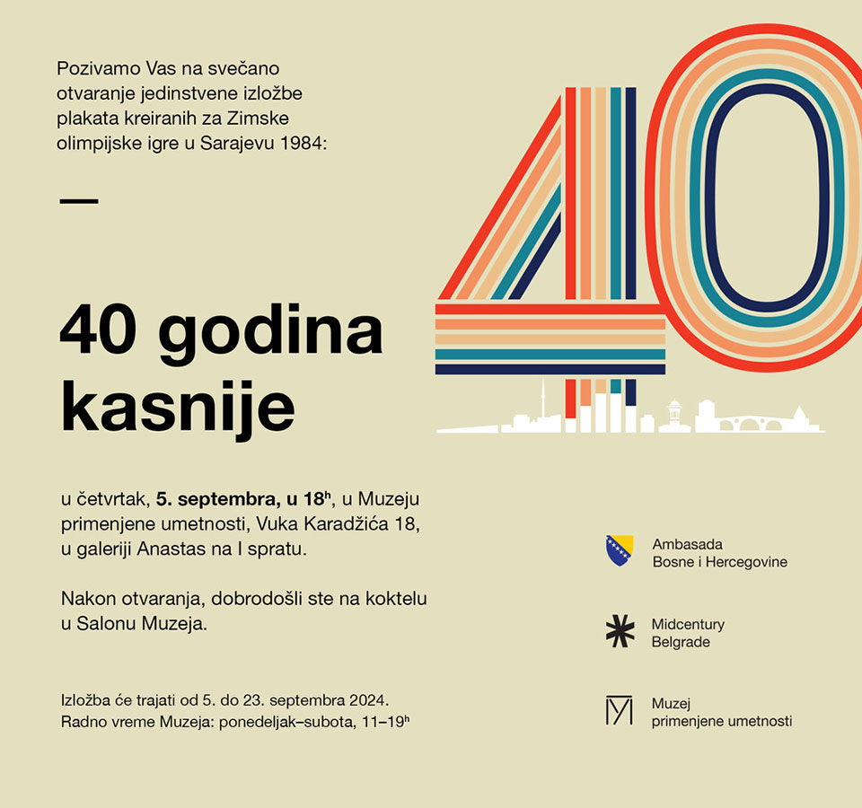 U četvrtak, 5. septembra, u 18 časova, u Muzeju primenjene umetnosti, je svečano otvaranje Izložbe plakata stvorenih za Olimpijske igre u Sarajevu: 40 godina kasnije. U nizu pionirskih poduhvata koji su obeležili i proslavili Olimpijske igre u Sarajevu, ističe se i doprinos primenjenoj umetnosti, ostvaren putem kompletnog grafičkog materijala kreiranog radi promocije Igara. U cilju kulturno-umetničkog obeležja manifestacije, u sklopu Organizacionog komiteta igara oformljen je kreativni tim koji je brinuo o promociji i kreaciji vizuelnog identiteta. Tim su činili ugledni profesori Muhamed Кaramehmedović, Ismar Mujezinović, Mladen Кolobarić, Mersad Berber, Ismet Dizdarević i drugi istaknuti članovi.