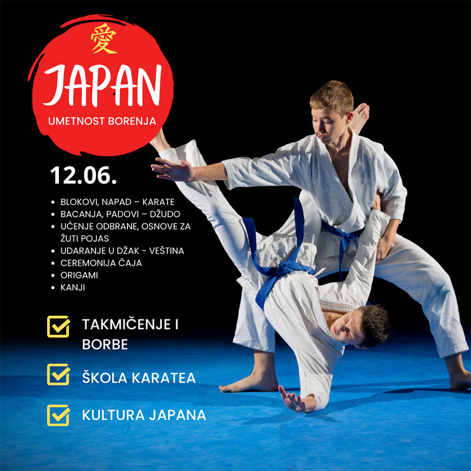 Ada Mall shopping center u saradnji sa Karate klubom NIPON i Udruženje za promociju japanske kulture KIZUNO na trećem spratu na platou u food courtu organizuje specijalno druženje u nedelju 12. juna posvećeno JAPANU i njegovoj umetnosti borenja. Naša proslavljena karate šampionka Tanja Petrović biće domaćin manifestacije u čijem fokusu će se naći takmičenje i borbe članova profesionalnih klubova, mini škola karatea i radionice koje će nas upoznati sa kulturom zemlje Izlazećeg sunca. Za sve rekreativce pripremili smo mogućnost da se oprobaju u karateu, džudou, nauče više o odbrani jer tu su osnove za žuti pojas. Za one koje privlači egzotična strana japanske kulture, posebno će uživati u ceremoniji ispijanja čaja, izradi origamija, ispisu imena na kanđiju i drugo.