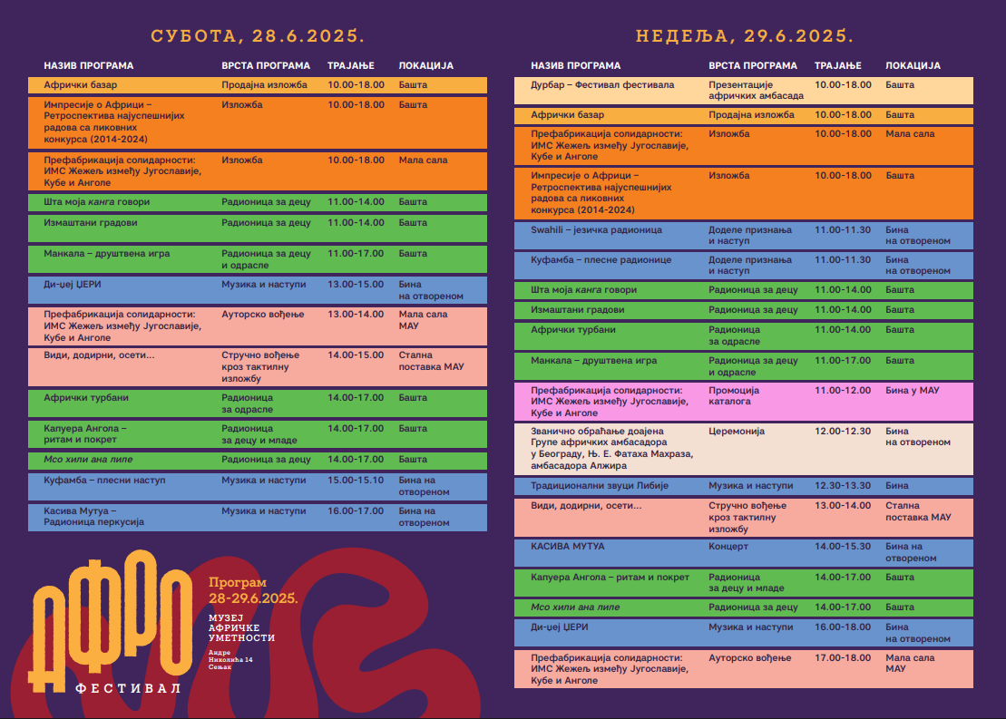 Muzej afričke umetnosti u Beogradu sa ponosom najavljuje novo izdanje Afro festivala, koji se održava 28. i 29. juna 2025. godine. Više od dve decenije, Afro festival predstavlja jedinstveni događaj na kulturnoj sceni Srbije – prostor otvorenog dijaloga, učenja, umetničke razmene i slavljenja bogatstva afričke kulture.