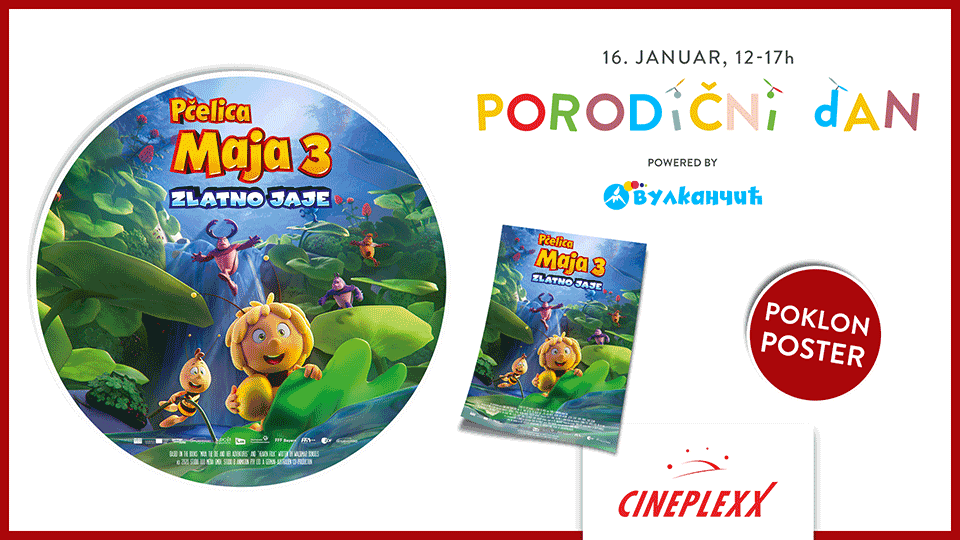 Porodični dan uz najnovije pustolovine pčelice Maje i njenih prijatelja zakazan je za nedelju 16. januar od 12 do 17 časova u svim Cineplexx bioskopima. Sve mališane očekuje poklon originalni poster filma ,,Pčelica Maja 3: Zlatno jaje“ a najsrećnije i poklon izdanja Vulkančića. Karte su u prodaji na blagajnama bioskopa i putem aplikacije CineplexxRS. Kad Maja i Pavo, spasu princezu mrava, naći će se usred epske bitke koja će ih odvesti u čudne nove svetove, a njihovo prijateljstvo staviti na iskušenje. Majine se pustolovine i ovog puta odvijaju u prirodi i pozitivne su priče pune nade, prijateljstva i tolerancije. Baš ono što nam svima treba! Mala Maja živahna je i znatiželjna pčelica, koja baš i ne voli pravila.