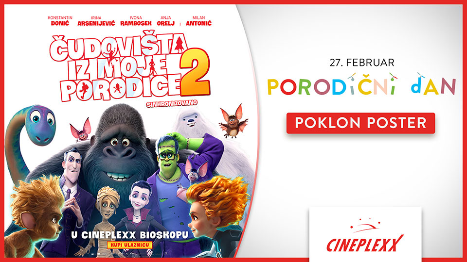 Porodični dan uz nastavak animiranog hita ,,Čudovišta iz moje porodice“ očekuje vas u nedelju 27. februara od 12 do 17 časova u svim Cineplexx bioskopima! Za sve mališane smo obezbedili originalni poklon poster filma. Karte su u prodaji na blagajnama bioskopa i putem aplikacije CineplexxRS. Nastavak velikog animiranog hita iz 2017. godine ,,Čudovišta iz moje porodice“ je adaptacija istoimenog bestselera Emmy-em ovekovečenog autora Davida Saflera (Berlin, Berlin), koji je preveden na 18 jezika i objavljen u preko 40 zemalja. Porodica uz pomoć svoja tri kućna ljubimca ponovno obilazi svet kako bi spasili prijatelje, stekli nova monstruozna poznanstva i konačno shvatili da niko nije savršen i da čak i oni sa manama mogu pronaći sreću.