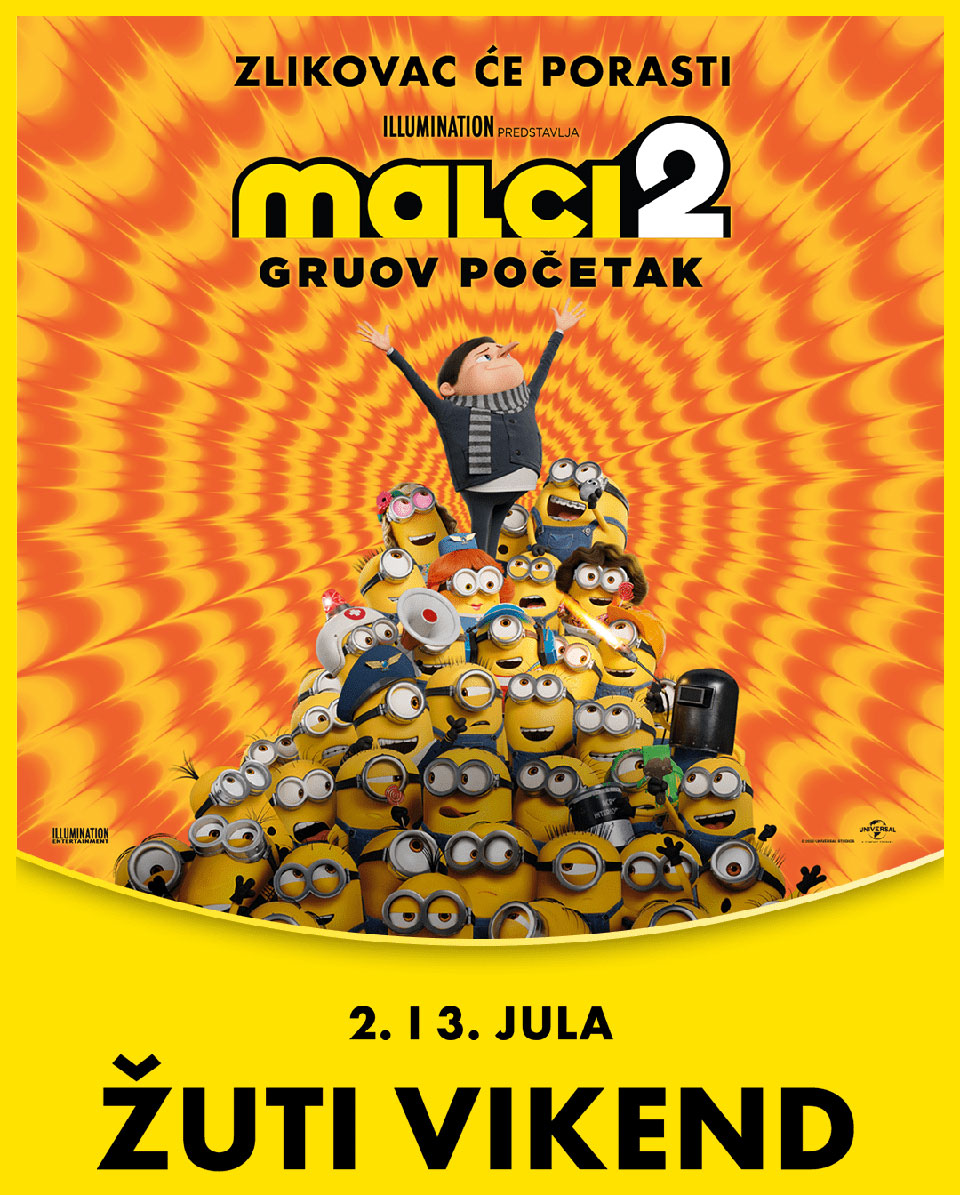 U subotu, 2. jula i nedelju, 3. jula od 12:00 do 17:00 časova očekuje vas Žuti vikend uz film “Malci 2- Gruov početak” u svim Cineplexx bioskopima. Pogledajte nastavak najzanimljivije animirane avanture i nasmejte se od srca uz vaše omiljene Malce. U jeku sedamdesetih godina prošlog veka, u sred pomame za bujnim raspuštenim kosama i zvoncarama, Gru (Stiv Karel) odrasta u predgrađu. Veliki fan super-grupe super-zlikovaca, Gru smišlja plan kako da postane dovoljno zao da može da im se pridruži. Srećom, u tome ima veliku pomoć svojih vernih podanika, Malaca. Zajedno, Kevin, Stjuart, Bob i Oto, novi Malac koji nosi protezu i ima očajničku potrebu da ugađa, razvijaju veštine dok zajedno sa Gruom grade svoje prvo sklonište, eksperimentišu svojim prvim oružjem i kreću u svoju prvu misiju.