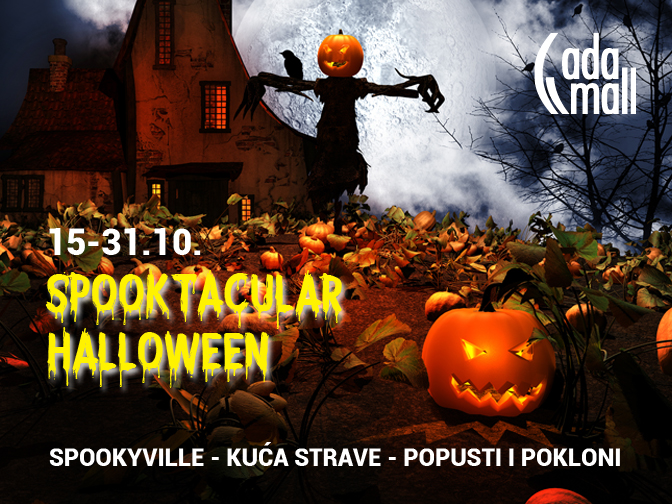Oktobar ove sezone pretvaramo u Zloktobar! U susret najzabavnijem i najstrašnijem prazniku NOĆ VEŠTICA, ADA MALL shopping center priprema specijalni program do 31. oktobra, uz super popuste. Jedinstveni projekat na ovim prostorima, KUĆA STRAVE, za svoje posetioce ovim povodom priprema specijalni program, novi scenario sa strašnim kreaturama. Oktobar mesec tako poprima razmere ZLOKTOBRA, a u okviru akcije očekuju vas nagradni specijali svakog petka, uz Halloween maskembar 31.10. Nagradna akcija KRVAVI PETAK stavlja vas na muke i daje vam zadatak da pronađete ukletu jabuku. Za najhrabrije i najveštije stižu pokloni. KUĆA STRAVE nalazi se na prvom spratu ADA MALL, pored H&M. Posebna draž ovog Hallweena u Ada Mallu biće aktivacija SPOOKYVILLE na trećem spratu ADA MALL-u.
