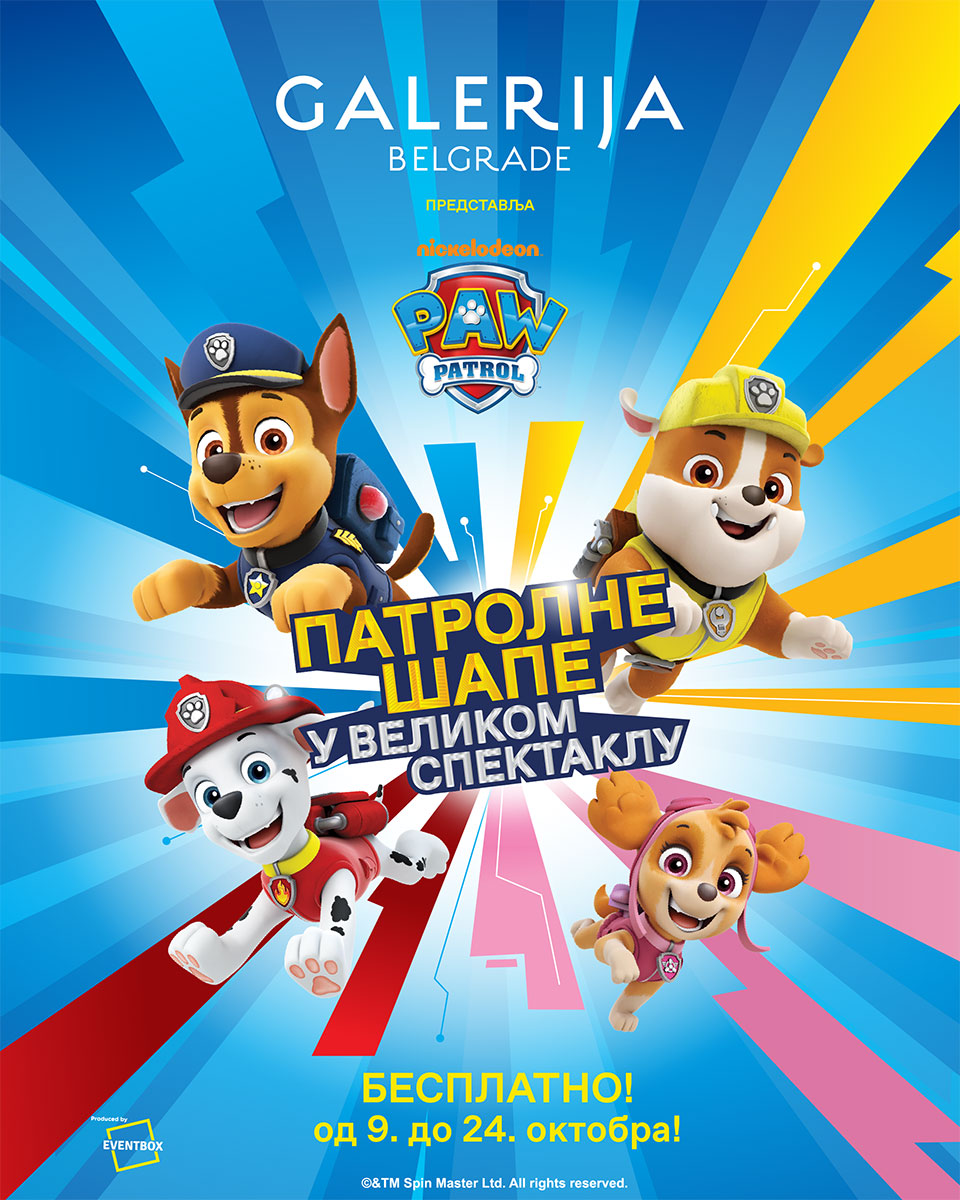 Nikelodeonove Patrolne šape su spremne za akciju! Legende iz Zaliva pustolovina: Čejs, Maršal, Rabl, Skaj i Rajder u svojoj novoj spasilačkoj avanturi posetiće Galeriju prvi put od 9. do 24. oktobra, a ulaz na manifestaciju je besplatan! Ovo je događaj u kom će uživati cela porodica! Predstava "Patrolne šape u velikom spektaklu" održava se na glavnoj bini tri puta dnevno od 16, 18 i 19:30 sati, a slikanje sa maskotama posle svake predstave u 16:45, 18:45 i 20:15 sati. Mališane pored predstave očekuje još jedan izazov – Patrolne šape su spremile poligon spretnosti u delu Zaliva pustolovina, koji je otvoren od 13h do 21h svakoga dana tokom trajanja manifestacije. U ovom tematizovanom kutku, putovanje započinje na poligonu koji decu vodi kroz šest aktivnosti sa njihovim omiljenim kucama. Mališani će im pomoći u misijama spasavanja, učeći o važnosti timskog rada, recikliranja i o mnogim drugim značajnim temama.