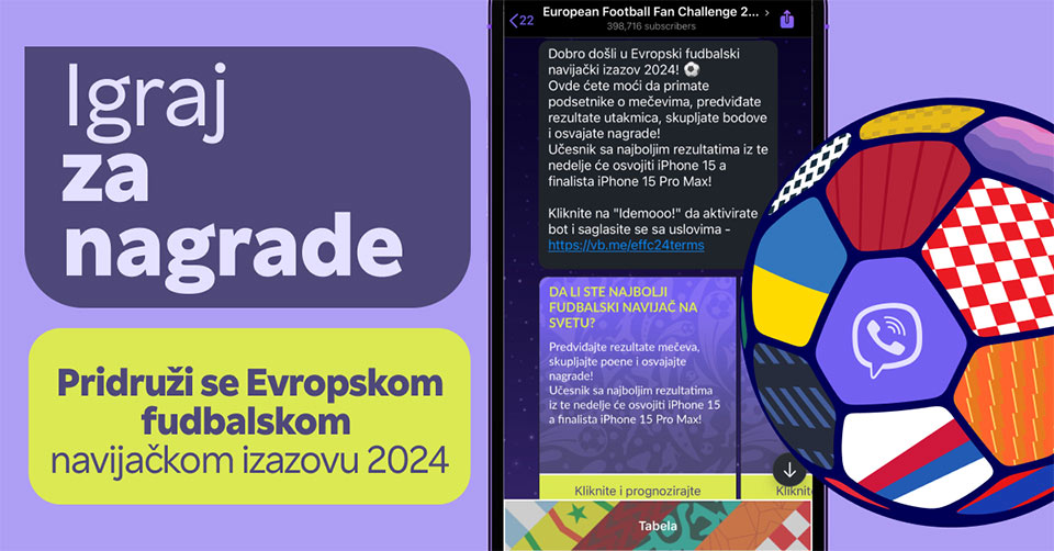 Rakuten Viber, vodeća globalna platforma za privatnu i bezbednu razmenu poruka i glasnovnu komunikaciju poziva sve prave ljubitelje fudbala da uživaju u fudbalskoj groznici koju predstojeće Evropsko prvenstvo nosi sa sobom tako što će učestvovati u njenoj interaktivnoj nagradnoj igri prognoziranja rezultata - i time se još više približiti pravoj akciji u društvu svojih prijatelja, članova porodice i kolega. Ljubitelji fudbala imaće priliku da postave svoje prognoze na globalnu tabelu čime će iskazati podršku svojim timovima i steći priliku da osvoje neku od aktraktivnih nagrada: po jedan iPhone 15s tokom svake od 4 nedelja trajanja igre, kao i jedan iPhone 15 Pro Max kao glavnu nagradu. Fudbal kao “najvažnija sporedna stvar na svetu”, po rečima čuvenog trenera Karla Anćelotija, spaja njegove istinske ljubitelje iz cele Evrope i šire na najvažnijem kontinentalnom fudbalskom takmičenju. U slavu takmičarskog duha, fer-pleja i nacionalnog timskog ponosa Viber je pripremio širu akciju za navijače koja će im omogućiti da se druže i komuniciraju povodom svake utakmice.