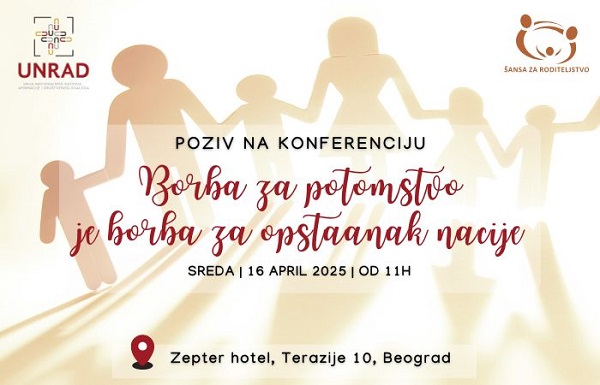 Udruženje UNRAD i Šansa za roditeljstvo vas srdačno pozivaju na konferenciju „Borba za potomstvo je borba za opstanak nacije“, koja ima za cilj da okupi sve relevantne aktere i otvori prostor za konkretne predloge i rešenja.