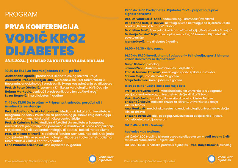 Prva konferencija „Vodič kroz dijabetes“ održava se 28. maja 2024. godine u Centru za kulturu Vlada Divljan u Beogradu, od 10 do 17 časova. Na konferenciji će govoriti stručnjaci iz različitih oblasti, a više o temama i ko su panelisti možete videte u programu konferencije u prilogu. Paralelno sa centralnom konferencijom održaće se dve radionice/savetovališta iz oblasti psihološke podrške i pravilne ishrane, a svi posetioci imaće mogućnost da provere nivo šećera u krvi i izmere pritisak. Ovo je jedinstvena prilika da se na jednom mestu sazna više, postave pitanja, dobiju odgovori i razmene iskustva. Ulaz na konferenciju je besplatan, uz prethodnu prijavu na linku >> Dijabetes se smatra jednom od najčešćih hroničnih nezaraznih bolesti koja je u ekspanziji u broju obolelih u celom svetu, posebno u slabo i srednje razvijenim zemljama među koje spada i Srbija. U Srbiji je registrovano 700 000 obolelih, štočini12,4% stanovništva. Stručnjaci smatraju da na svakogo bolelog dolazi po još jedna osoba koja ne zna da ima dijabetes zbog blagih simptoma bolesti.