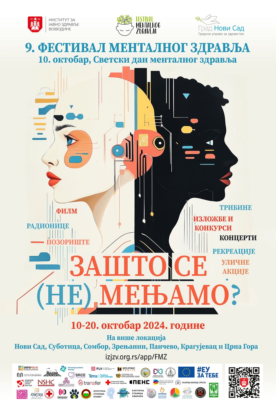 Institut za javno zdravlje Vojvodine, u saradnji sa brojnim ustanovama i organizacijama, obeležava 10. oktobar, Svetski dan mentalnog zdravlja, organizovanjem devetog Festivala mentalnog zdravlja, od 10. do 20. oktobra 2024. godine. Ovogodišnja tema je „Odnos prema promenama u društvu“, a slogan: „Zašto se (ne) menjamo?“. Festival mentalnog zdravlja u Novom Sadu podržala je Gradska uprava za zdravstvo Grada Novog Sada u okviru projekta „Svi zajedno za bolje mentalno zdravlje u Novom Sadu u 2024. godini“ a podršku pruža i Pokrajinski sekretarijat za zdravstvo AP Vojvodine. Festival mentalnog zdravlja održava se od 2016. godine u Novom Sadu, a od 2022. godine pridružuju se partneri iz Subotice i Sombora, te 2023. godine iz Zrenjanina, Pančeva, Кragujevca i gradova Crne Gore. U organizaciji Festivala u Novom Sadu učestvuje široka mreža partnera koja uključuje 3 institucije, 13 ustanova i 16 udruženja građana. Tokom Festivala imaćemo priliku da zajedno razmišljamo, pričamo i podižemo svest o temi koja nikada ne prestaje da bude aktuelna i važna – mentalnom zdravlju.