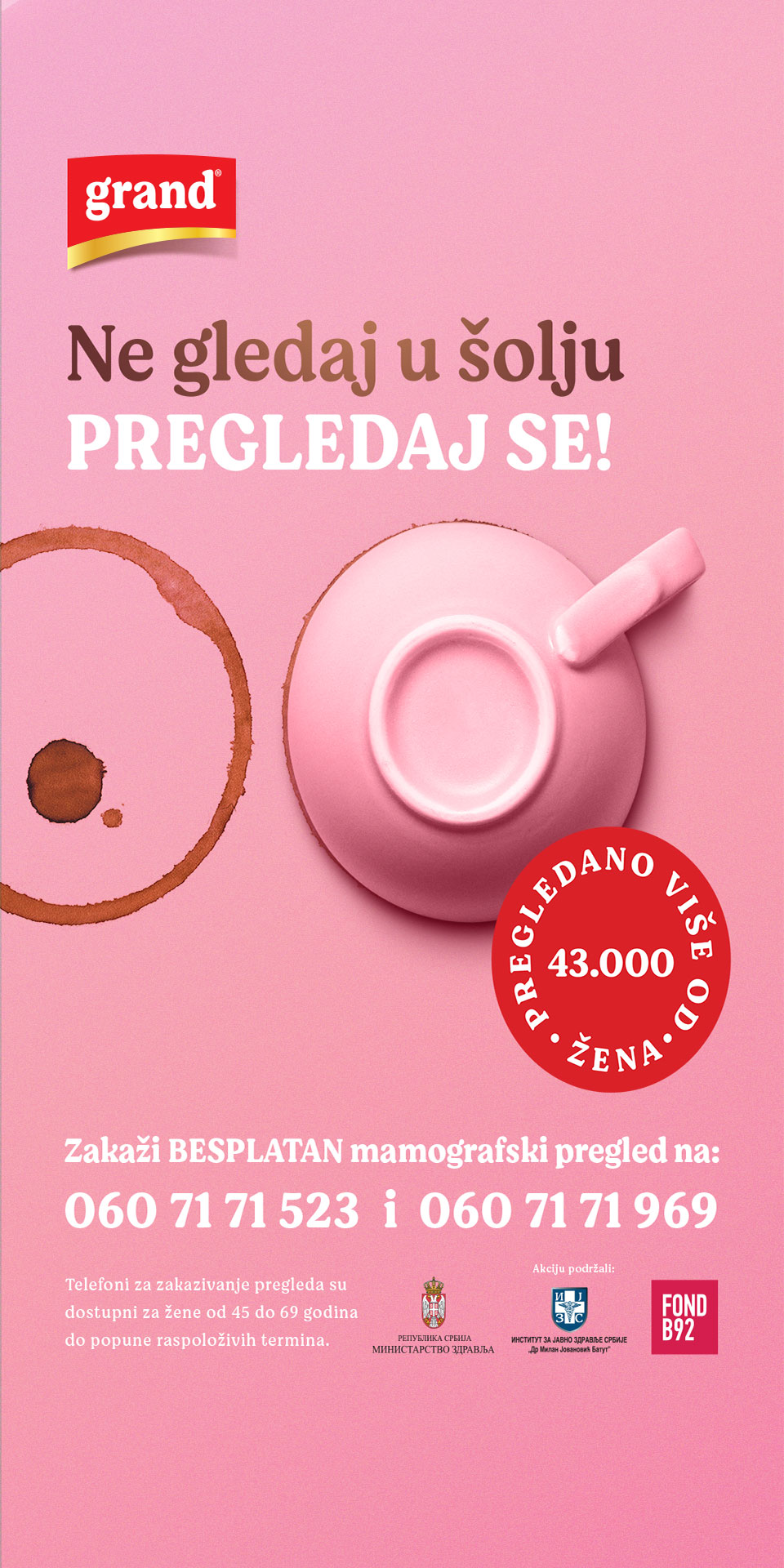 Besplatni mamografski pregledi u okviru akcije „Hajde da imamo vremena za pregled“, koju Grand kafa sprovodi zajedno sa Institutom za javno zdravlje Srbije „Dr Milan Jovanović Batut“, pod pokroviteljstvom Ministarstva zdravlja i u saradnji sa Fondom B92, pod sloganom „Ne gledaj u šolju, pregledaj se“, i ove godine biće dostupni ženama i u oktobru. Tokom ovog Međunarodnog meseca borbe protiv raka dojke, mobilni mamograf će biti postavljen na Kalemegdanu, a od petka 4. oktobra, svoj termin za preventivni mamografski pregled dame će moći da zakažu radnim danima od 9 do 14 časova, na brojeve telefona 0607171969 i 0607171523, do popunjavanja termina. U okviru ove akcije, od 2021. godine, preventivne preglede uradilo je više od 43.000 žena.